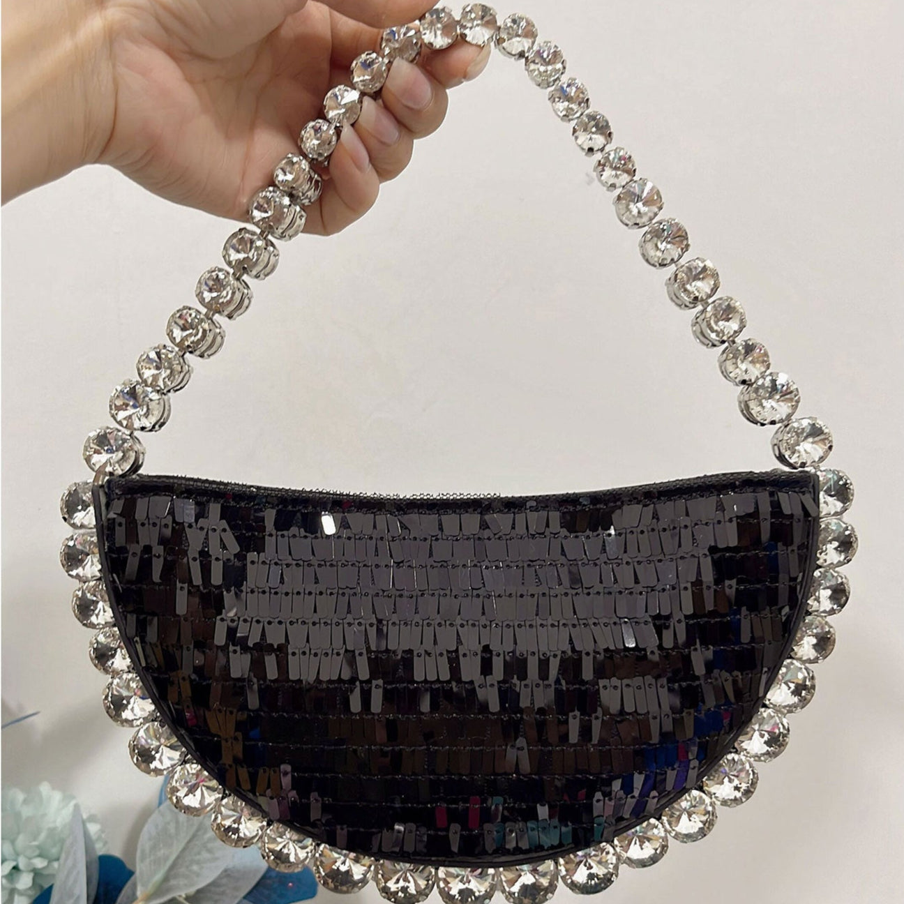 Brilla con estilo y sofisticación con nuestra elegante bolsa de fiesta con lentejuelas negras y asa de cristales. Este bolso se distingue por su diseño en forma de media luna, cubierto con detalles de lentejuelas negras que reflejan la luz de manera sutil y elegante. El borde y el asa están adornados con cristales grandes que añaden un toque deslumbrante, convirtiéndolo en el accesorio perfecto para las noches más especiales. Ideal para quien busca un complemento que combine lujo y modernidad, esta bolsa es el acompañante ideal para cualquier evento de gala o fiesta.
